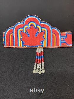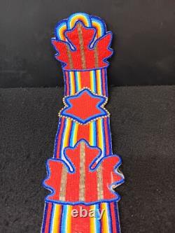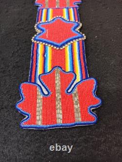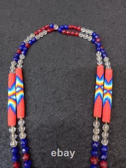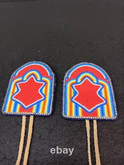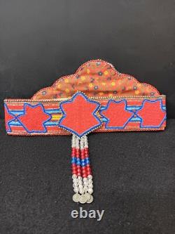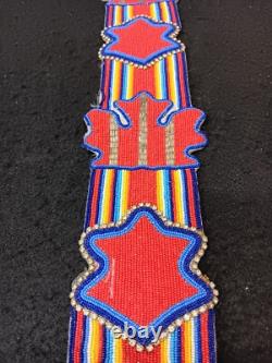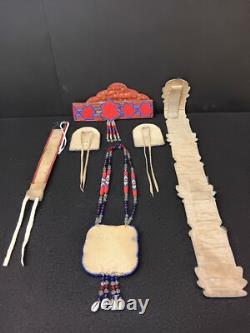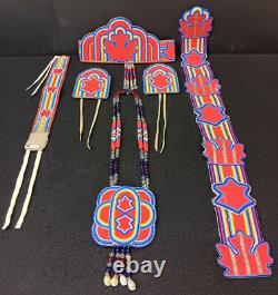 NICE 6 PIECE CUT BEADED NATIVE AMERICAN INDIAN LEAF DESIGN CROWN, DRAG, CHOKER, HAIRTIES, AND NECKLACE. This nice 6 piece Native American Indian leaf design dance set features a nice cut beaded crown, cut beaded choker, cut beaded drag piece, cut beaded rosette necklace, and a pair of beaded hairties. The pieces are beaded with small size 13 cut beads, glass fire polished beads, rhinestones, and buckskin laces. This set was made by Nancie Poodry; Tribe: Sac/Fox. This set is in overall great condition with some slight wear from use. This beautiful Indian dance set is a great deal at its low price. DIMENSIONS: THE CROWN IS 5" TALL AND 20 1/2" INSIDE. THE SIDES ARE 2 3/8 TALL. THE DRAG PIECE 45" WIDE AND 29" LONG. THE HAIRTIES ARE 4 3/4" LONG AND 3 3/4" WIDE. THE CHOKER IS 11 1/2" LONG AND 1 1/2" WIDE. THE BEADED NECKLACE IS 24" LONG WITH A 4 1/2" BY 4 1/2 ROSETTE. CONDITION: This set is in great condition with slight wear from use.