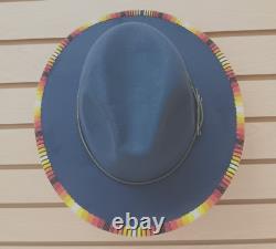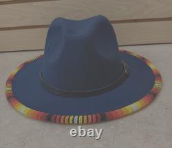 Adjustable Large Hand Beaded Native American Indian Dark Blue Fedora Felt Hat