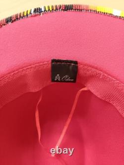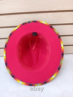 NICE ADJUSTABLE LARGE HAND BEADED BRIM NATIVE AMERICAN INDIAN DARK BLUE FEDORA FELT HAT. This nice dark blue large(adjustable with laces)fedora felt hat features hand beaded beadwork done with small round beads around the brim. The beadwork was done by Nancie Poodry; Tribe: Sac/Fox. The hat is in great condition. This beautiful hat is a great deal at its low price.