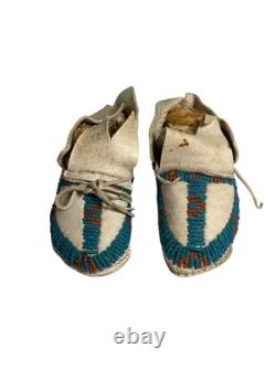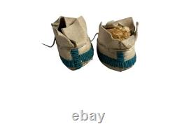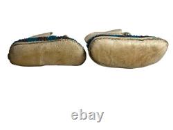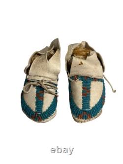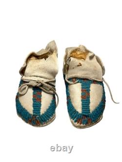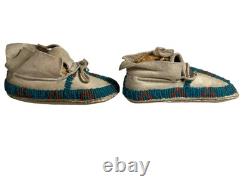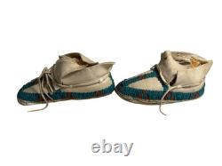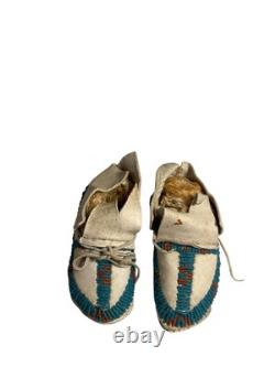 These antique Native American Northern Plains Sioux baby or child moccasins are a beautifully preserved piece of cultural heritage. Featuring intricate hand-beaded designs, they demonstrate the same level of care and craftsmanship given to adult regalia, scaled delicately for a young child. Their petite size and detailed artistry reflect the traditions and values of the Sioux people in the early 20th century. Condition: Good overall condition; general wear; kindly see photos. Measurements: Each is about 4.25 inches long.