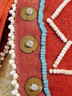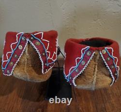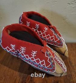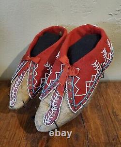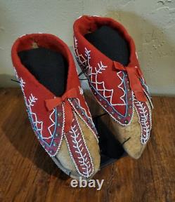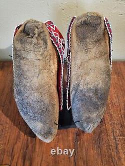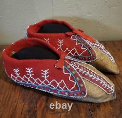 Beautiful rare eastern Seneca or Huron beaded moccasins. Moccasins beaded with seed beads and red trade cloth. The ribbonwork shows age from fading you can see the underside color and when the metal sequin is lifted the orig color can be seen. This only comes from age! Length: size just over 10.5.
