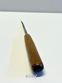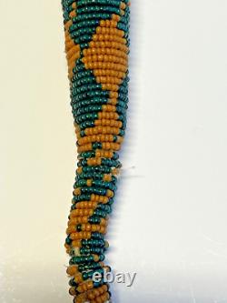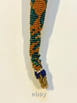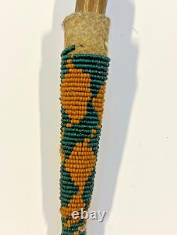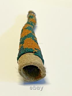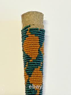 Experience a piece of history with this authentic Late 19th Centurry Native American Indian beaded sheath accompanied by a wooden handle Awl with a metal blade. Sheath measures 6 inches long x 1 inches wide and Awl's wooden handle measures 5 1/2 inches long x 2 1/2 inch blade/pick. Expertly handmade, this sheath is a testament to the intricate artistry and craftsmanship of the era, reflecting the rich culture of Native American tribes across the United States. In great shape with minor loose beads here and there and tip of case soft and at an angle but all there. The sheath, with its meticulously crafted beads, is a representation of both utility and aesthetic, showcasing the skilled hands of its creator.