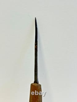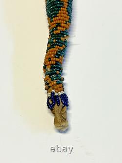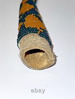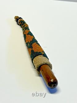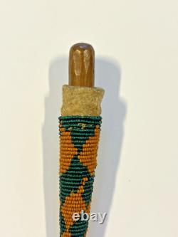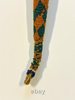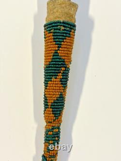 Experience a piece of history with this authentic Late 19th Centurry Native American Indian beaded sheath accompanied by a wooden handle Awl with a metal blade. Sheath measures 6 inches long x 1 inches wide and Awl's wooden handle measures 5 1/2 inches long x 2 1/2 inch blade/pick. Expertly handmade, this sheath is a testament to the intricate artistry and craftsmanship of the era, reflecting the rich culture of Native American tribes across the United States. In great shape with minor loose beads here and there and tip of case soft and at an angle but all there. The sheath, with its meticulously crafted beads, is a representation of both utility and aesthetic, showcasing the skilled hands of its creator.
