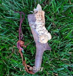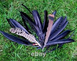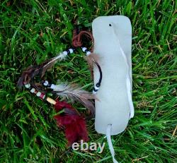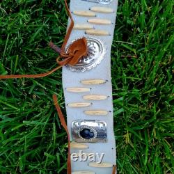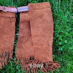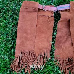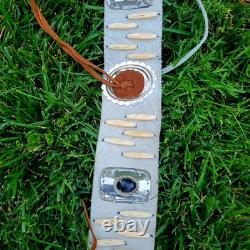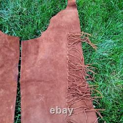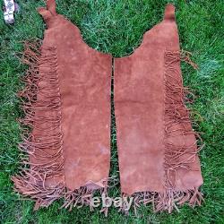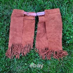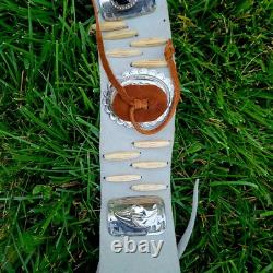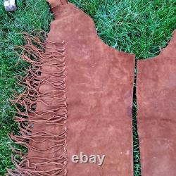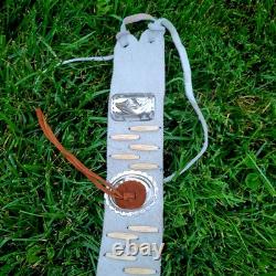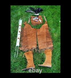 The "Rain Dance" outfit is an authentic Native American cow hide regalia made in the United States. This handmade piece represents the cultural significance of Native American tribes and their traditional practices.