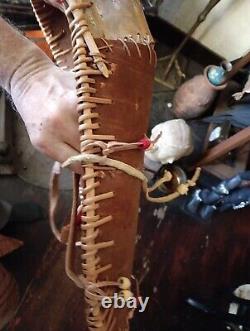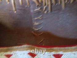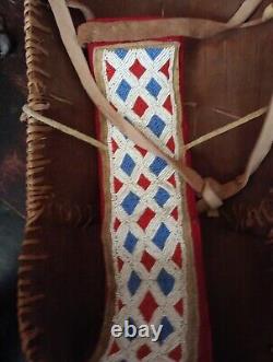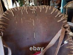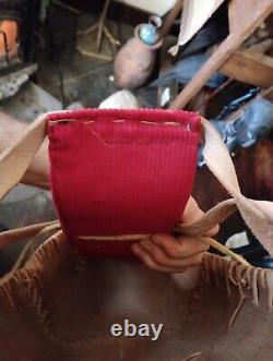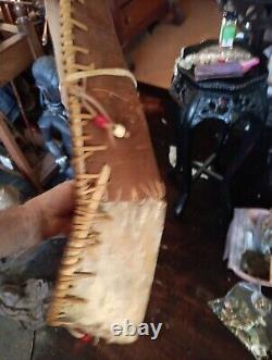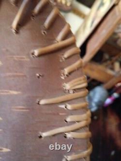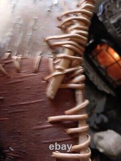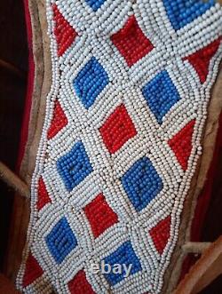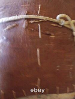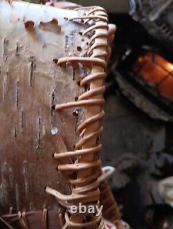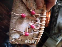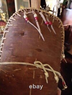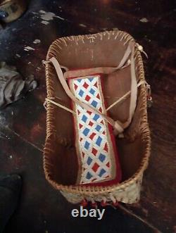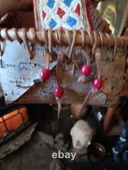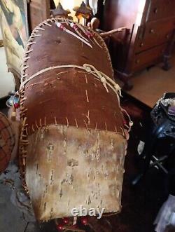 Made of Birch bark and other tree bark with a strip of beads down the middle to keep the baby inside. Measures about 21 x 11 z 4 inches. Frame is made of wood sewn together with tree root. Large red beads on side are not glass but a modern man made substance.