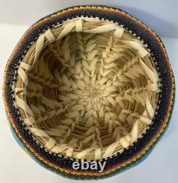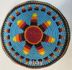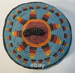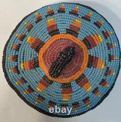 This basket is is very colorful and beautifully designed. The basket is estimated to be from 1980 or after. Some of the colors of the beading used include red, yellow, orange, green, black and white beading. The black and white beading create a nice contrast with the colorful beads and allow for the design to stand out. At the top and bottom of the basket there is a sun or floral design. Around the base of the basket there is some spiraling detailing that comes out of the black, white and red rows on the basket. All of the following measurements are approximate. The diameter os the basket is 3" and the height of the basket is 3 1/16" The basket is in great condition with no missing beads. This is a great colorful Washoe/Paiute lidded beaded basket! Be sure to check out our other Washoe/Paiute beaded baskets we currently have listed! Check out our other listings for more great items!