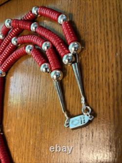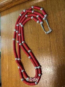 The design is reminiscent of vintage Pueblo coral necklaces found in museums and old collections that have a number of sterling silver beads scattered randomly among the coral. Photos of such necklaces have appeared in various well-known southwest themed magazines and reference works on southwest native jewelry. The heishi beads are about 8 mm in diameter and are believed to be made of howlite. The artist, who wishes to remain anonymous, stated that the design and creation of the necklace was inspired by examples of vintage coral necklaces that were seen while living in Colorado and during visits to Santa Fe. The artist also noted that a sterling silver Taxco clasp was re-used on this necklace, which is marked 925.