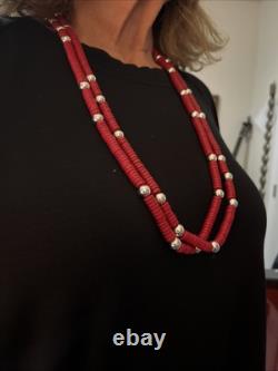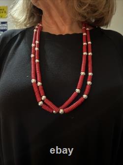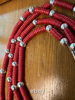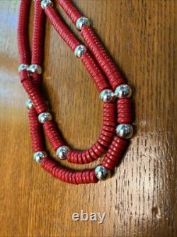 Custom, recently made, one-of-a-kind Southwest Native American-inspired necklace, with red heishi beads in imitation of coral interspersed randomly with silver colored metal beads. This necklace is strung on stainless steel multi-strand wire.