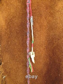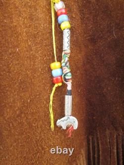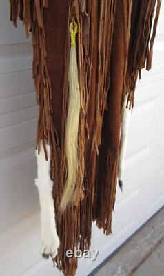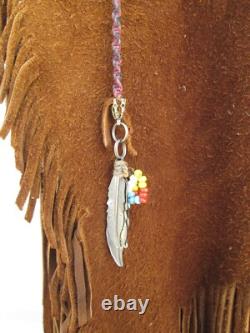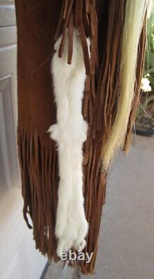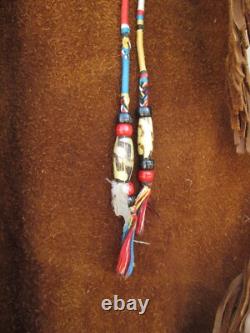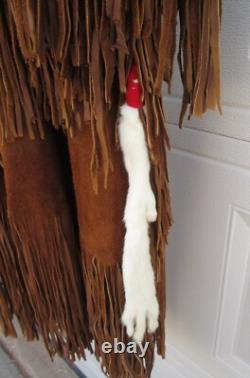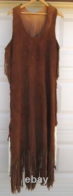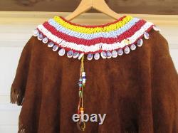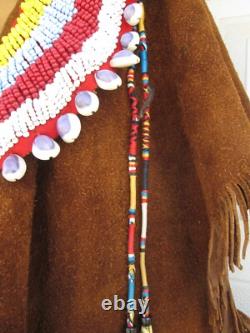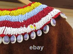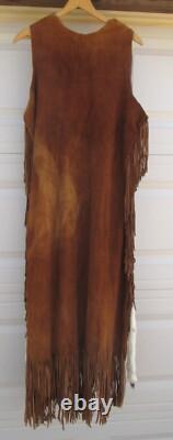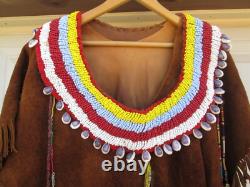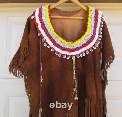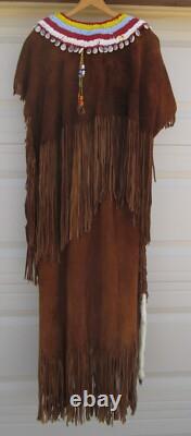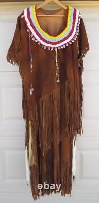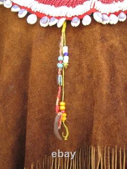 It has Zuni fetishes and the Cowrie shells are what the Crow and Plateau tribes used. The under dress measures approximately 13 inches across the top from outer end of shoulder to outer end of shoulder with the neck opening approximately 7 inches across. It measures approximately 42 inches from the center back top of the neck to the bottom excluding the approximately 9 inch fringe. Approximately 21 inches from outer lower arm opening to the opposite lower arm opening.