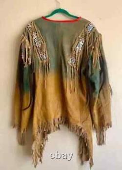 Native American Western Wear Suede Leather Jacket Fringes & Beads Work War Shirt. 100% GENUINE SUEDE LEATHER COWBOYS MENS JACKET? Traditional Western Style Cowboys Jacket made with 100% genuine Suede leather. WESTERN FRINGE JACKETS FOR MEN Excellent Cowboy western bones and beads coat is for western style leather-wear jacket for complete cowboy look.