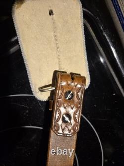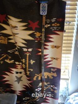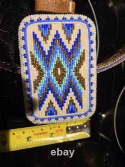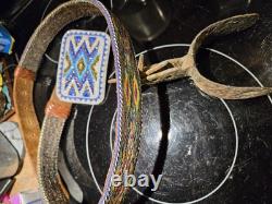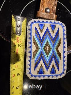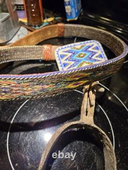 The product is a stunning handmade glass beaded belt buckle with a Nez Pierce belt, originating from Montana and affiliated with the Nez Perce tribe. This unique piece reflects the beauty and craftsmanship of Native American culture, specifically in the United States. The intricate beadwork and design make it a special collectible item that showcases the rich heritage and artistry of the Nez Perce people. Please see pictures for specific buckle and belt measurements. The hitched horsehair belt is 43" long by 1 1/4" wide.