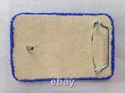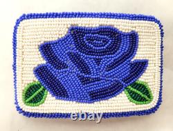 Here we have a Native American Beaded Belt Buckle Blue rose Design. The Buckle is roughly 4.25 inches across, 3 inches high.