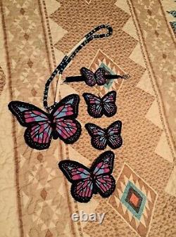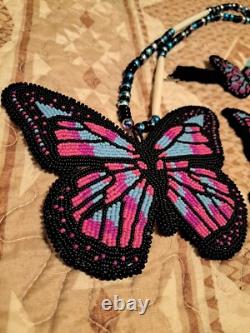 This set was handcrafted by a very talented Cherokee young lady. The butterfly pendant is (in inches) 5x6, barette 4x5, the earrings are approximately 4x3 and the bracelet about 2x3. Black, blue, pink and purple beading.