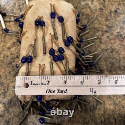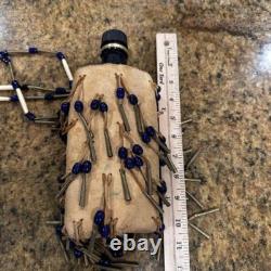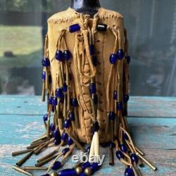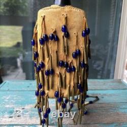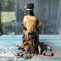 Native American Plains Indian Canteen Cover Bag 10 tall Leather Brass Conicals Cobalt Blue Beads. Hand Crafted Vintage Soft Tanned Cattle or Deer Hide Leather with Leather Strips Used to Decorate with Various Glass Beads Brass Metal Cones Pipe Beads. Has Plastic Bottle To Give Form However This Can be Changed to a Glass or Metal Bottle as Desired.