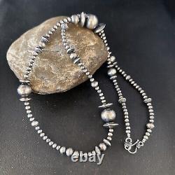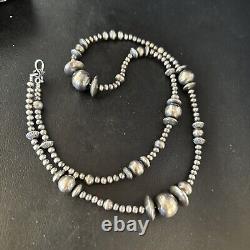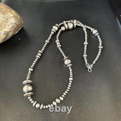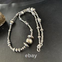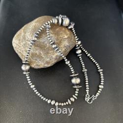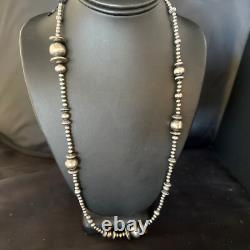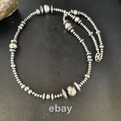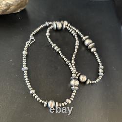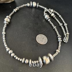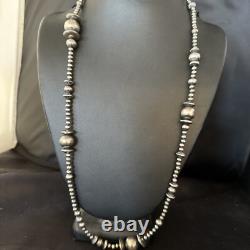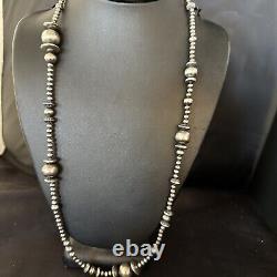 Native American Sterling Silver Navajo Pearls Mixed Beads 18 Necklace. Bead size : 4mm - 14mm. This beautiful Navajo Pearls Necklace is made from all 925 Sterling Silver Beads and Findings. These Beads are meticulously strung, then Hand Oxidized, ? Antiqued & Polished, creating the perfect Navajo Pearl. The beads are then Strung again on Surgical Grade Stainless Steel with a Hypoallergenic Nylon Coating to make the beautiful design variations that are offered with unparalleled strength and durability. These Necklaces are a must have for any collection, whether you're just starting out or are a serious collector you will not be disappointed with this work of art. These necklaces have excellent fall and can even be stacked with others, fashioned with a pendant, or worn double wrapped to give you a distinctive look every time. We have been in this industry since 1972. Our Jewelry is Authentic Artisan Handcrafted Sterling Silver. It is Designed, Manufactured, Finished, Polished, and Assembled in the USA by Local Native American Artists without any base metal or plated findings (unless otherwise specified).