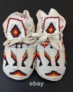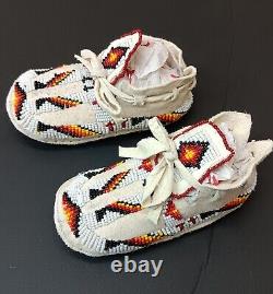 NICE KIDS SIZE 6 HAND CRAFTED BEADED GEOMETRIC DESIGN BUCKSKIN NATIVE AMERICAN INDIAN MOCCASINS. This nice pair of handmade kids beaded Native American Indian buckskin moccasins feature hand done Native American geometric design beadwork done with small round beads, beaded buckskin tongues, and buckskin laces. These moccasins are made by J.