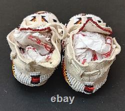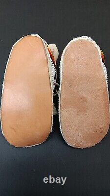 They are tied with nylon and are made from soft white buckskin. This set of moccasins are in great condition with slight dirt on them. This beautiful pair of Native American Indian buckskin moccasins are a great deal at their low price. DIMENSIONS: THE MOCCASINS ARE 5 1/4" LONG AND ARE 2 1/4" WIDE AT THE WIDEST PART OF THE SOLES. ACORDING TO A CHART WE HAVE THAT WOULD BE A CHILDS SIZE 6.