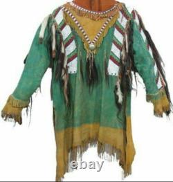The soft suede leather provides a luxurious and comfortable feel, while the hand-cut fringes add a unique touch of style and movement. The intricate beadwork is made by hand, with careful attention to detail and design, making each piece truly one-of-a-kind. This product is made with a deep appreciation for Native American culture and traditions. It is intended to be a beautiful and functional piece of art that can be treasured for generations to come. Old style American Buckskin Buffalo Beaded Fringes Powwow Regalia War Shirt. Made with Genuine Hand colored Suede Leather. Hand Cut Fringes & Handmade Bead Strips Work. Hair Work with Open Sides.
