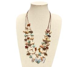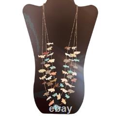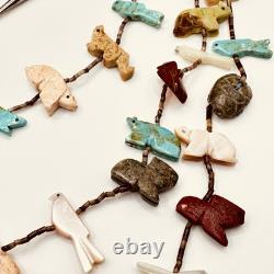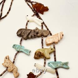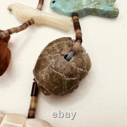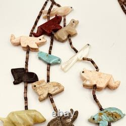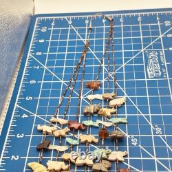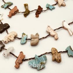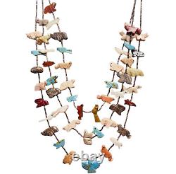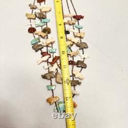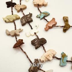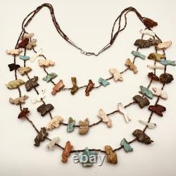 Vintage Southwestern Style 3-Strand Fetish Necklace - Carved Stone Animals - Sterling Clasp - 20. Description: This eye-catching vintage necklace features a Southwestern-inspired fetish style with three strands of hand-carved animal beads made from various natural stones. Each animal is uniquely shaped and colored, adding a charming and earthy touch to this multi-strand statement piece. Style : Southwestern-inspired animal fetish necklace.