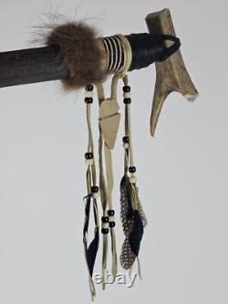 Vintage Native American Ceremonial Dance Medicine Stick Leather Antler Horn Beads. This vintage Native American Ceremonial Dance Medicine Stick Horn is a true piece of history. Complete with beads, feathers, leather wrapping. Handmade with care and precision, this item is a testament to the skill and artistry of Native American craftsmen. Good as pictured, there are some markings and wear.
