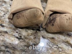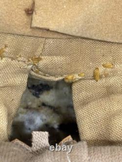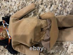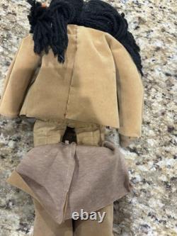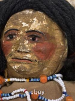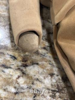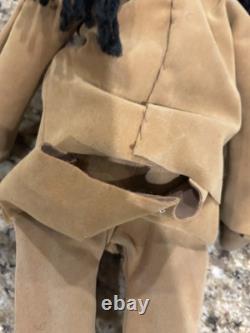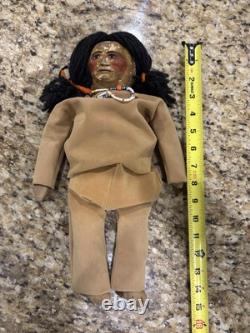 The clothes are not leather, but are some heavy cloth sueded type material, the head appears to be paper mache, not sure.