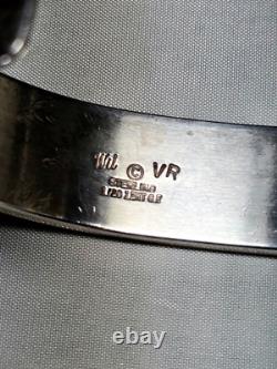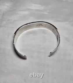 This bracelet measures 6 3/8 inches from opening to opening and 1 1/4 inches across the opening. The bracelet measures 17mm in width.