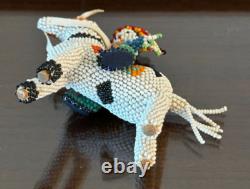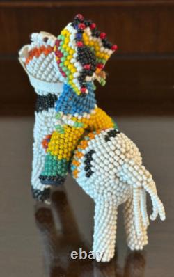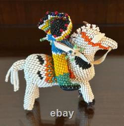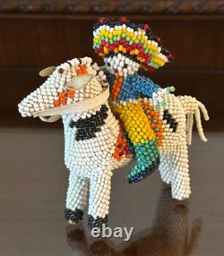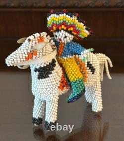 This stunning 1970's hand beaded (glass seed beads) figure features a horse & rider figure. NOTE: Any light spots seen are just the suede fabric body showing through (NO MISSING OR LOOSE BEADS).